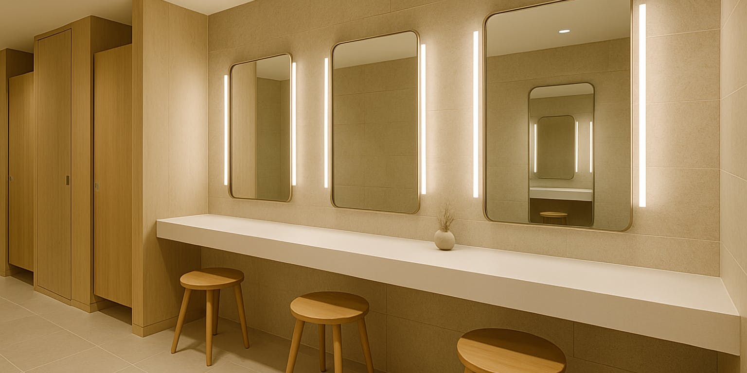 「パウダールーム」は、社内での印象を良くするだけでなく、社員の満足度やエンゲージメントを高めるための重要な要素です。例えば、女優ミラーを取り入れることで、明るい照明の中で顔の影ができにくく、さらに使い勝手が良くなります。これらの小さな工夫が、従業員の働きやすさや快適さに直結します。