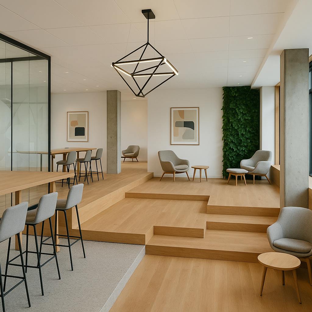ブランドカラーを取り入れる際は、壁に色を施すだけではなく、心理的な効果や配色のバランスを考えることが重要です。例えば、ブランドカラーが「青」の場合は、落ち着きや信頼感を与える特性を活かし、会議室や応接スペースに採用するのが効果的です。一方で、鮮やかな色をアクセントに使用する場合は、クリエイティビティを引き出す休憩スペースやフリースペースに取り入れることで、空間に活気と創造性が広がります。