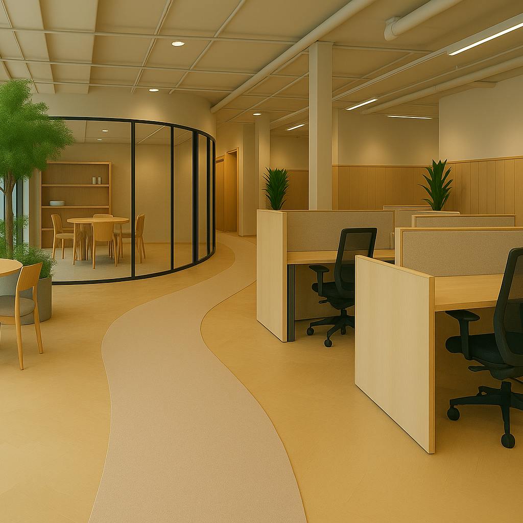 狭いオフィスでも、視覚的な工夫を取り入れるだけで、驚くほど開放感が生まれます。従業員の皆さまがストレスなく働くためには、実際の面積以上に“広く見せる”デザインが不可欠です。