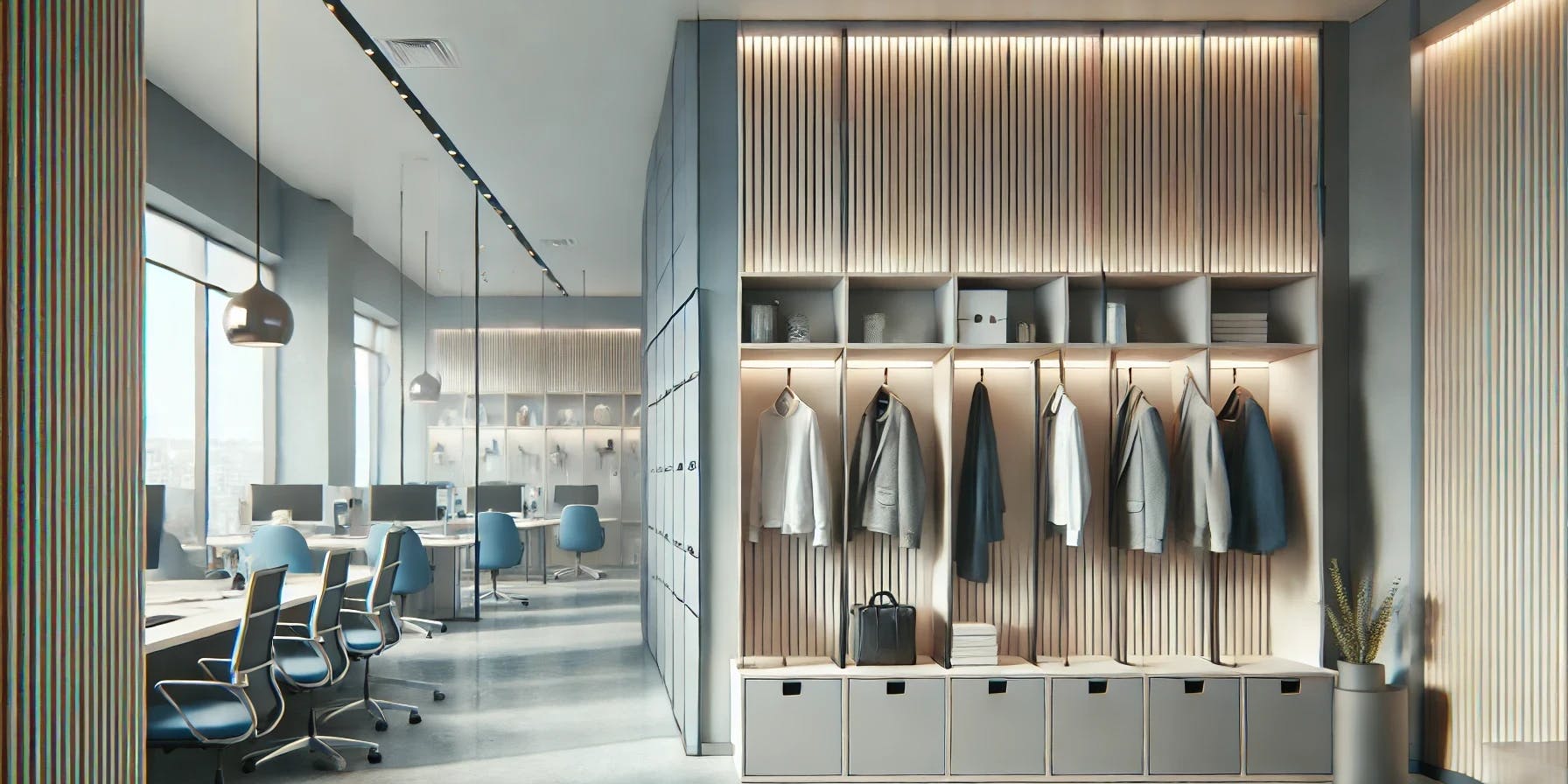 上着を収納する場所がオフィス内の動線に合わせて配置されていれば、使い勝手が向上します。例えば、オフィスの入り口近くにコート掛けを設置することで、上着を脱いだ瞬間に収納でき、他の作業を行う際に邪魔になることがありません。また、個人ロッカーをデスク周りに配置すれば、必要な時にすぐにアクセスでき、作業効率も向上します。