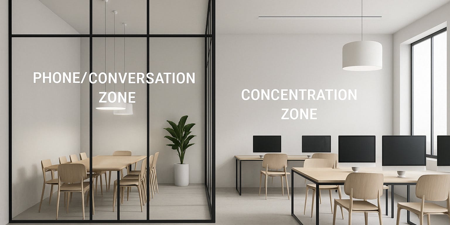 電話の声が多いオフィスと、静けさを求めるオフィス。それぞれの業務があるからこそ、音のストレスを減らすための空間のゾーニングが重要になります。空間を切り分け、視線・動線・素材・ルールを組み合わせることで、職場の雰囲気が大きく変わる可能性があります。