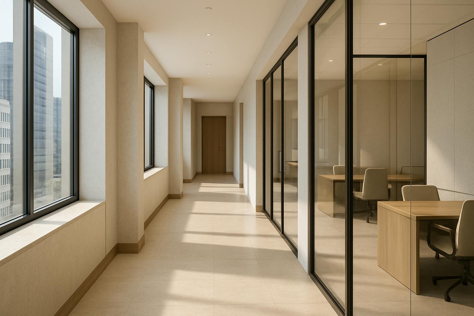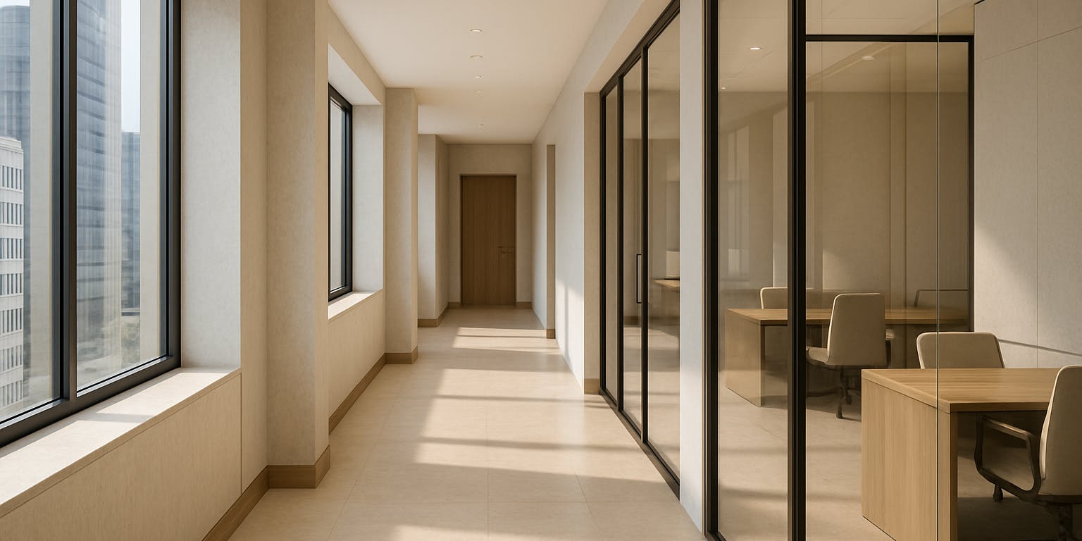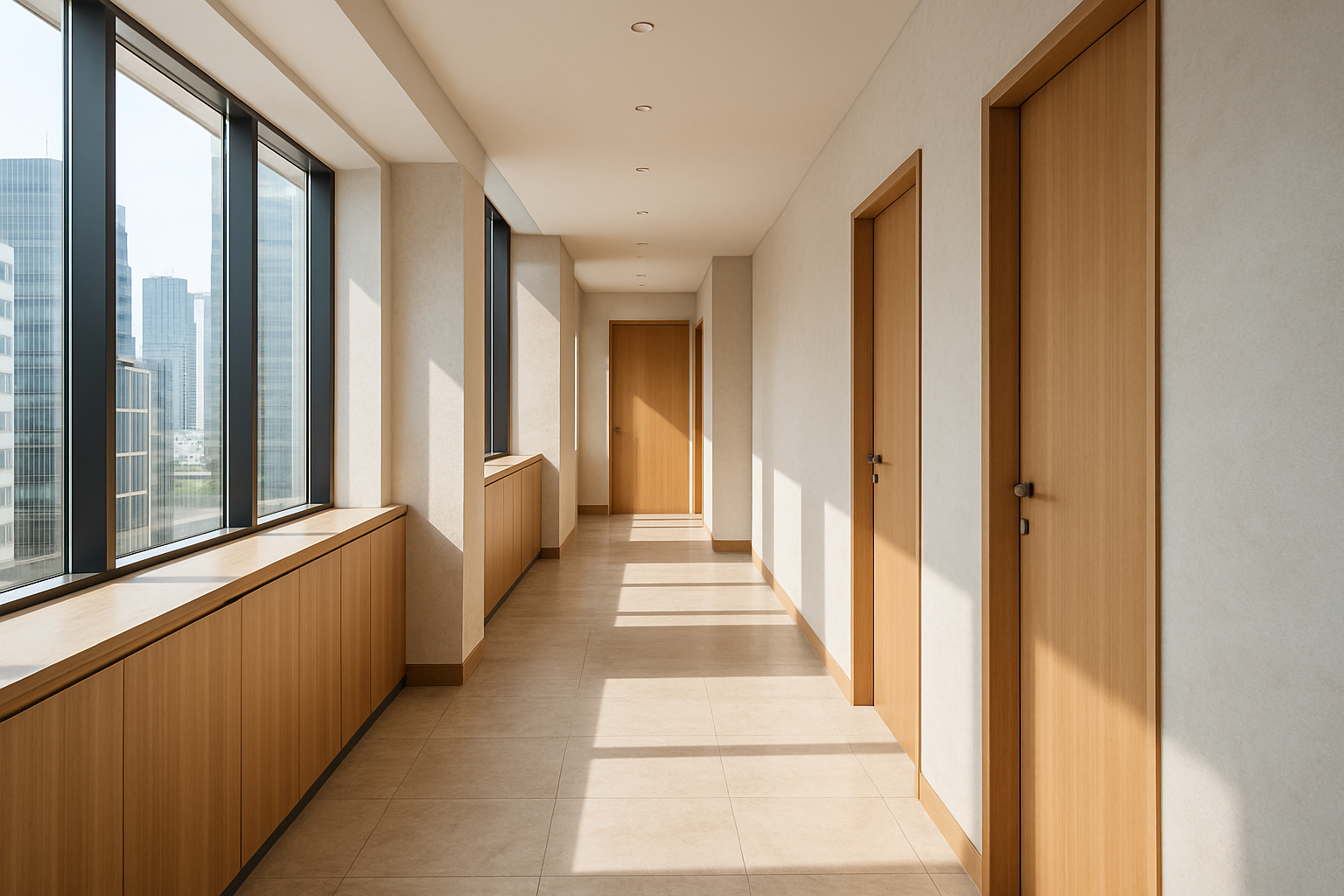 オフィス空間の設計では、見えない心理的な壁にも配慮が必要です。動線を分岐させる場合、通路の幅や照明、内装の色味をやわらかく調整し、緊張感を感じさせない工夫が求められます。