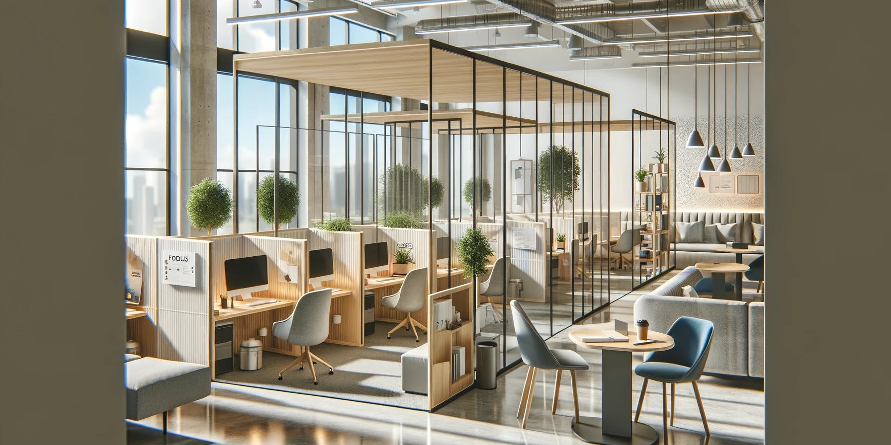 集中ブースを設けることで、個々の社員が集中して作業できる環境を提供します。また、これらのブースの近くには、社員が集まって話し合いや協働ができるスペースも設置します。このように、集中作業とコラボレーションのためのスペースを並列に配置することで、作業の効率化を図れます。