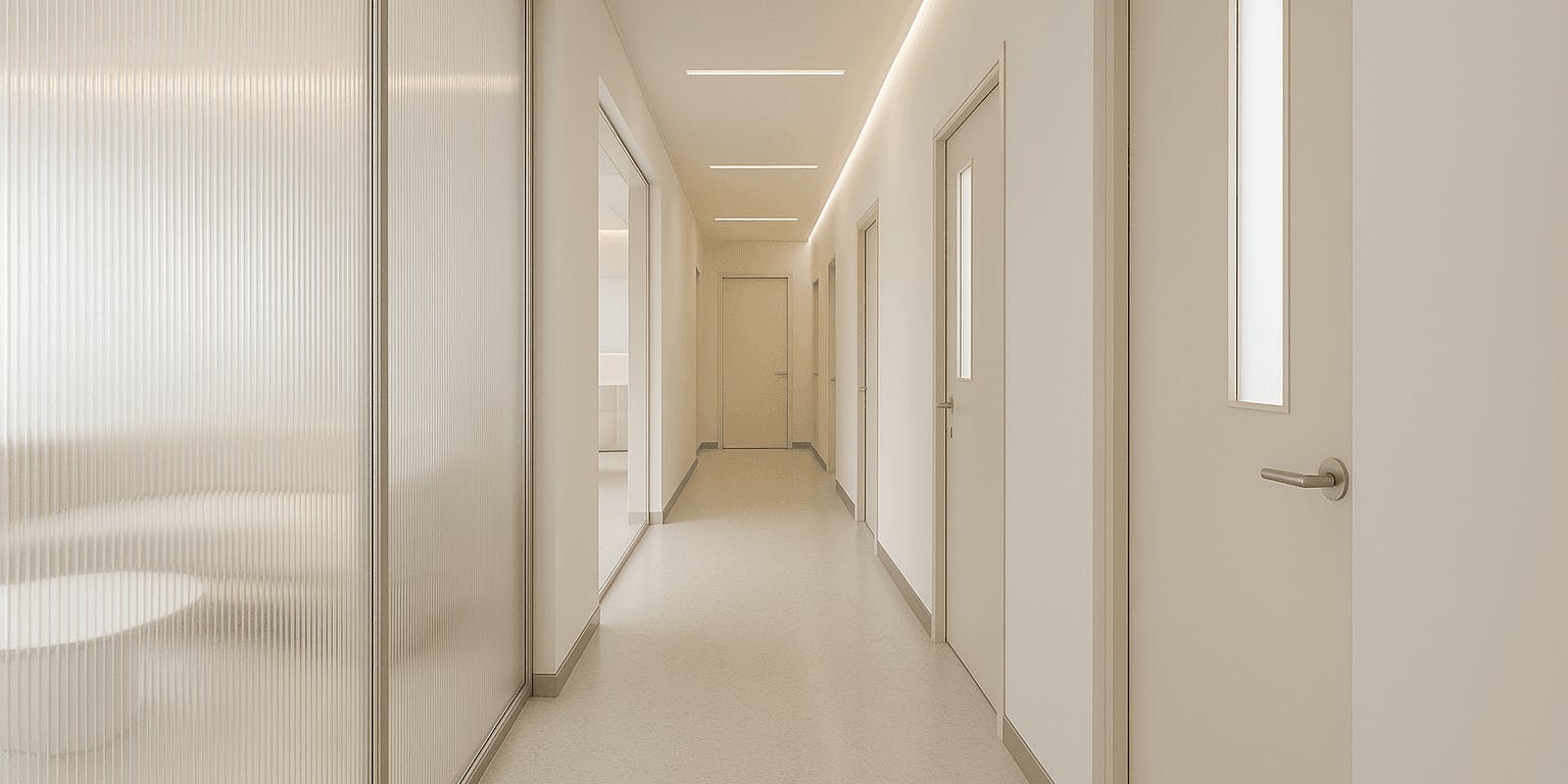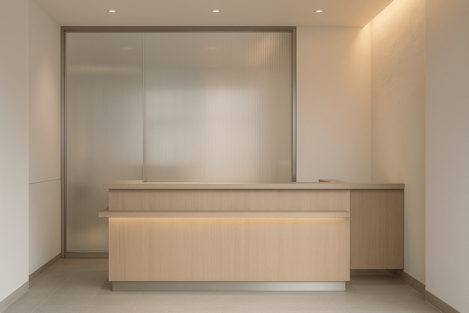 入口と受付は開示、カウンセリングと施術は遮蔽。エリアごとに透明度を段階調整し、図面と言葉(サイン)で境界を明確にする構成が、患者様と医療スタッフの皆さま双方の安心につながります。