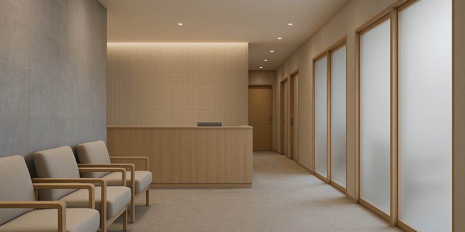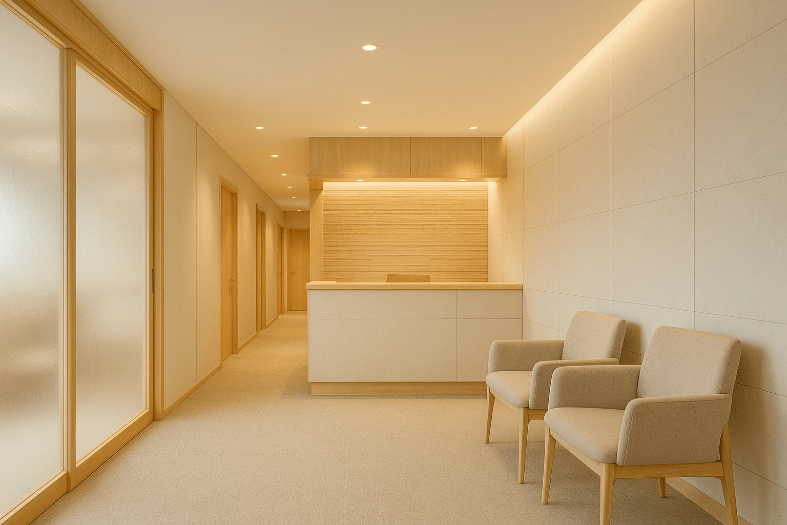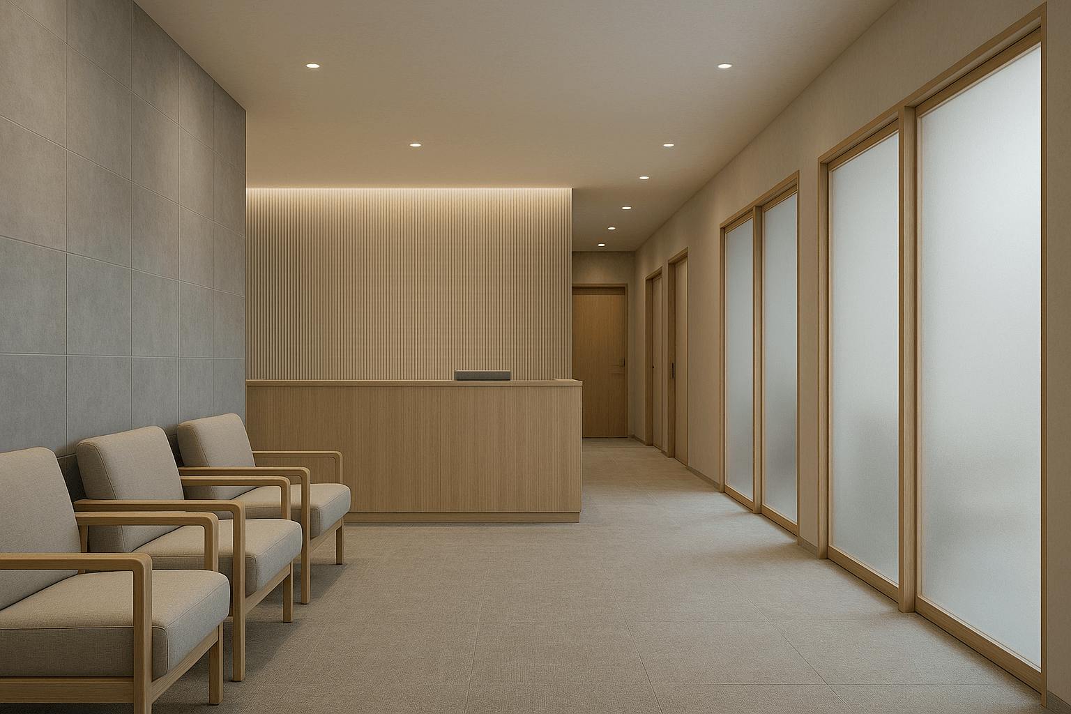 緊張の多くは「見られるかもしれない」「聞かれるかもしれない」という想像から生まれます。前室や廊下の仕切りにフロストガラス(光は通し、形や表情をぼかすガラス)を使い、気配は伝えて表情は守る設えにします。受付背面と天井の一部に吸音パネル(音を吸収する仕上げ材)を入れると、声量を上げなくても届き、会話が秘匿されている安心感が高まります。扉はソフトクローズ丁番(静かに閉まる機構)で開閉音を抑え、床はカーペットタイルを用いて足音と反響を減らします。小さな静けさの積み重ねが、判断の背中を押します。