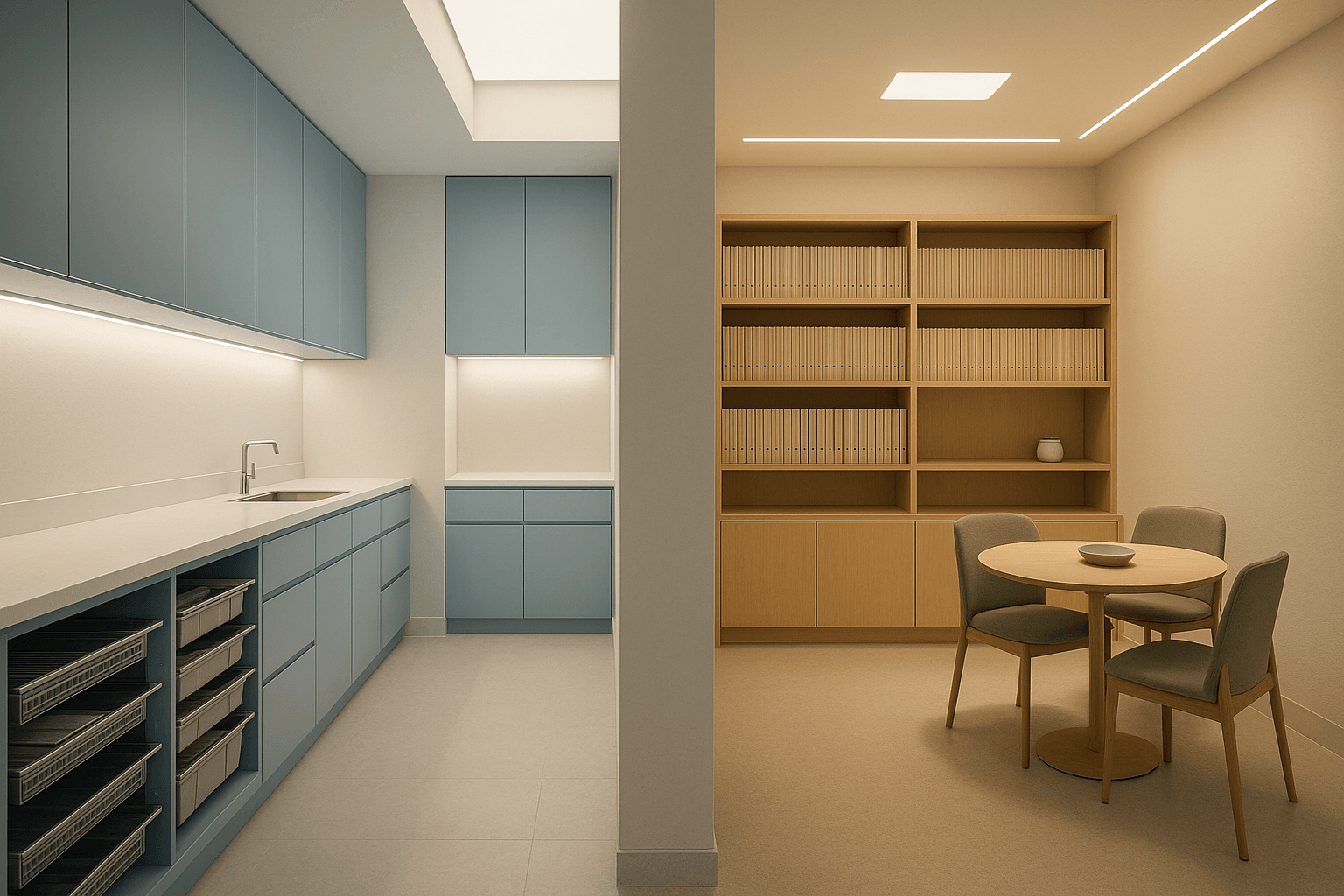 看護師導線とカウンセラーの皆さまの導線を分岐させるだけでも作業の集中度が変わります。家具の向きや壁面の使い方で境界を作ることもできます。