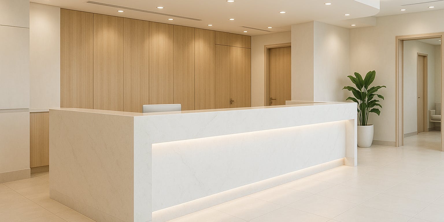 特に受付は「信頼の入り口」とも言える存在です。ここでは、高級感・安心感・清潔感を同時に叶えるための素材選びと配置の工夫について、株式会社SPACE PRODUCEが解説します。